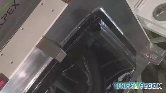 待HP-RTM樹脂固化結束,再次控制模具的合模間隙,并由預留的側孔及流道中注入低黏度的模具表面樹脂,并再次將模具完全閉合,擠壓膠衣樹脂使其盡可能的充模模具,并在制品表層噴涂一層均勻的樹脂膜。
