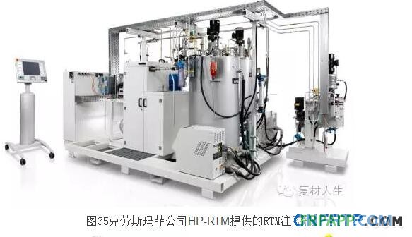 德國迪芬巴赫公司(Dieffenbacher)和克勞斯瑪菲公司(KraussMaffei)共同開發的高壓樹脂傳遞模塑成型工藝(HP-RTM)自動化生產線,兩家公司的具體分工情況如圖32所示;蒂芬巴赫公司開發的HP-RTM生產線用纖維預成型設備和壓制成型設備如圖33、34所示;克勞斯瑪菲公司設計開發的HP-RTM工藝用注膠機和混合頭如圖35、36所示。