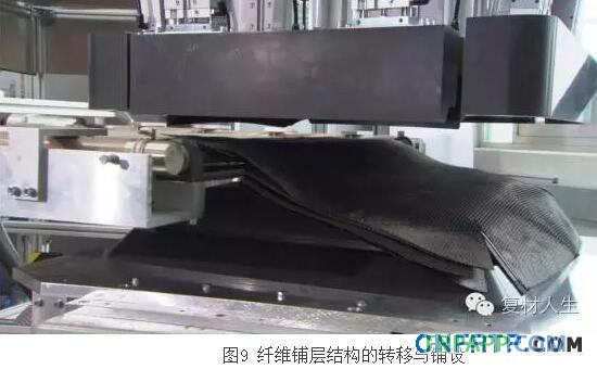 利用織物疊合輸送設備將疊合好的纖維織物轉移到纖維預成型設備上,如圖9所示;纖維織物轉移時,需精確控制輸送帶的移到速度和位置,防止纖維織物鋪放過程中發生移動或錯位,影響制件性能。