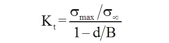 所以應力集中系數,應該反映應力分布差異的大小。如果已經理解了上面的文字,那么寫下下面的公式,相信就不難理解了。這里的σ∞是遠離小孔處的應力,σmax為小孔附近最大應力數值。而d為小孔半徑,B為含有小孔的部件寬度,他們的比值越小,應力集中系數越大。