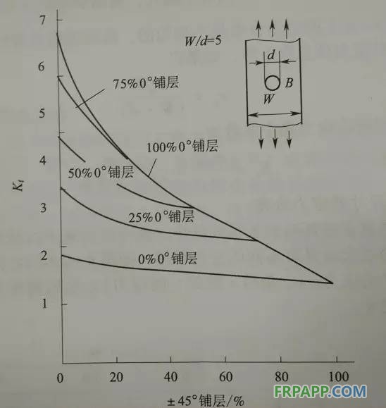 碳纖維復合材料鋪層情況對應力集中的程度有著不同的影響。下圖給出了不同鋪層情況下的應力集中情況。基本結論就是:0°鋪層越多,應力集中越嚴重,±45°鋪層起到降低應力集中的作用。