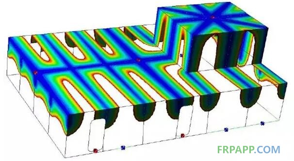 以復合材料結構件成形工藝中的樹脂傳遞模塑 (RTM) 成型工藝為例,大型結構件一體成型時,事先對樹脂充型過程進行有限元模擬,能夠指導工藝設計人員合理的安排布置樹脂導流管及樹脂出入口以避免干斑的出現。